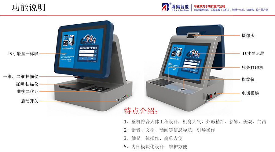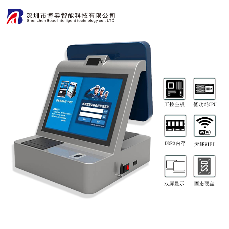 15寸雙屏智能訪客機BA-IVB2是我公司研新一代高端智能訪客登記管理設備,整機符合人體工程設計,機身小巧,外形新穎、美觀、簡潔,內部模塊化設計、維護方便;采用多點電容觸摸屏設計,點擊靈敏、操作方便,支持雙屏同步顯示和異步顯示,集成證件OCR掃描識別、身份證讀取,IC卡讀寫、人臉抓拍比對、指紋采集比對、條碼掃描、訪客單打印等功能,能夠迅速的完成訪客登記保存查詢工作。