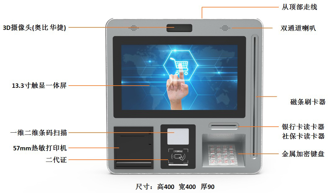 壁掛式社保一體機是博奧智能專為社保局、醫(yī)院、藥店等場所設(shè)計加工的一款集成多功能終端,采用安安卓系統(tǒng);本產(chǎn)品集成13.3寸觸顯一體屏、3D攝像頭(支持奧比、華捷)、熱敏打印機、身份證閱讀器、社保卡銀行卡讀卡器、磁條刷卡器、一維二維碼掃描、密碼銀行等模組,主要用來實現(xiàn)社保查詢、醫(yī)療繳費、購買藥品等。