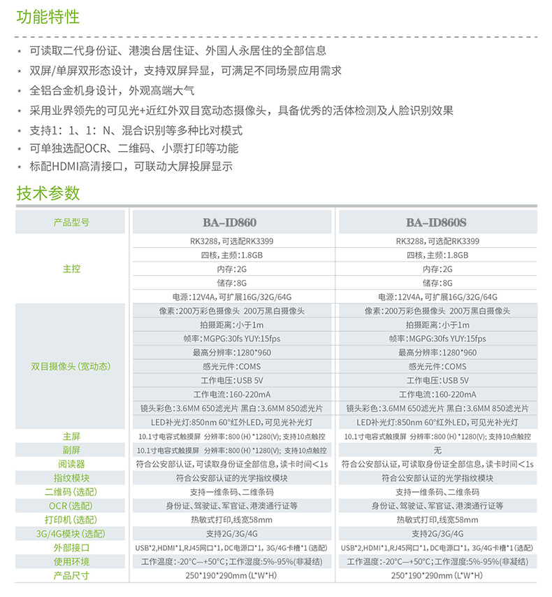 采用業界領先的可見光+近紅外雙目寬動態攝像頭,具備優秀的活體檢測及人臉識別效果