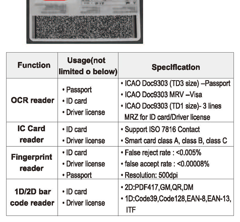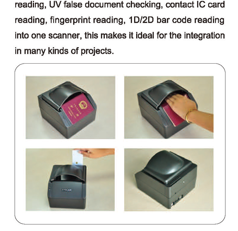 This is a high resolution document scanner for access control to speedread and verify ID documents like Passport, visas, identity cards, driver’s license, insurance card, medical card, so as to speed up the work flow and improve the work efficiency. It fulfills the globally growing needs for automated