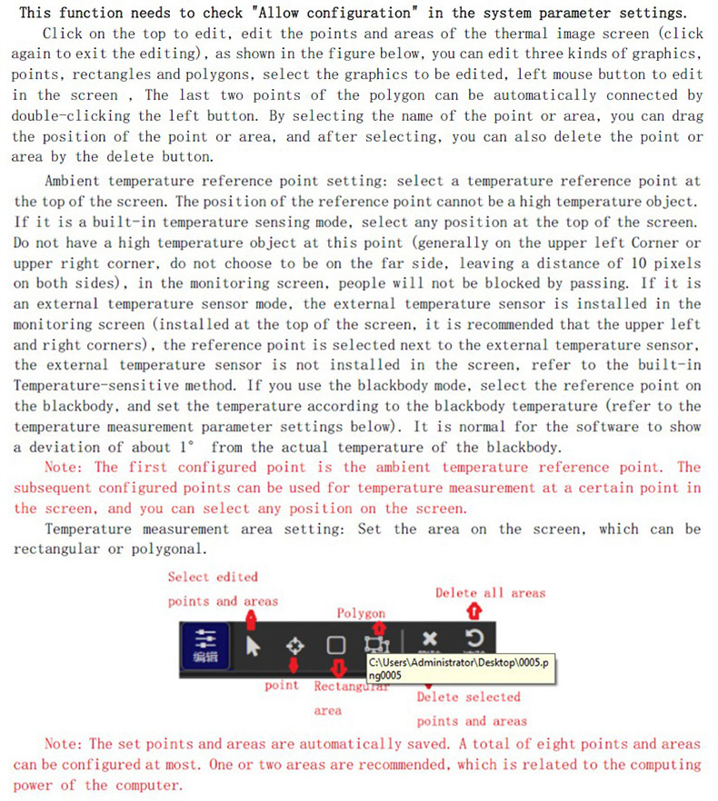 點擊上方編輯,編輯熱像畫面的點和區域(再次點擊編輯退出編輯),如下圖,可以編輯三種圖形,點、矩形和多邊形,選擇需要編輯的圖形,鼠標左鍵在畫面中編輯即可,多邊形最后兩點通過雙擊左鍵可以自動連接。通過選中點或區域名稱,可以拖動點或區域位置,選中后也可通過刪除按鈕刪除點或區域。