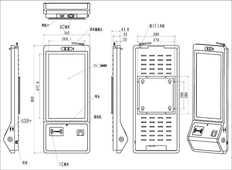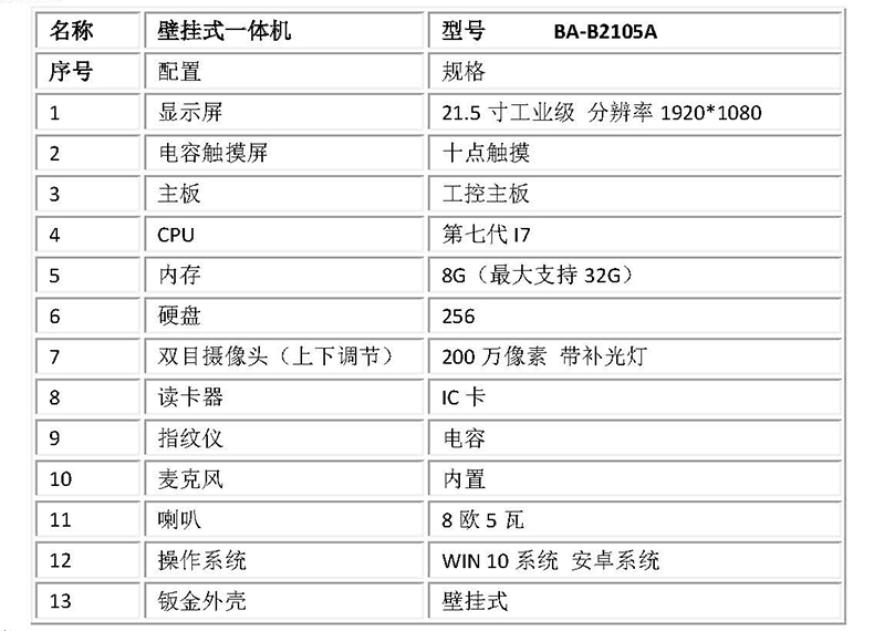 ? ?? ? BA-B2105A多功能壁掛式觸摸一體機(jī)支持WIN系統(tǒng)和安卓系統(tǒng),模塊化設(shè)計(jì),結(jié)構(gòu)合理;主要集成21.5寸高分辨率顯示屏、防爆多點(diǎn)電容觸摸、寬動態(tài)高清雙目攝像頭、IC卡讀寫器、指紋儀,并且根據(jù)功能需求可配置身份證閱讀器、熱敏小票打印機(jī)、條碼掃描儀等配件;?外殼采購鈑金材質(zhì),結(jié)實(shí)牢固;表面采用烤漆工藝,外觀精美實(shí)用,搭配各類軟件可適用于多種場合,比如酒店自助入助登記終端,商場自助收銀終端,高檔小區(qū)門衛(wèi)寫字樓大廳前臺用于來訪人員登記管理終端等。