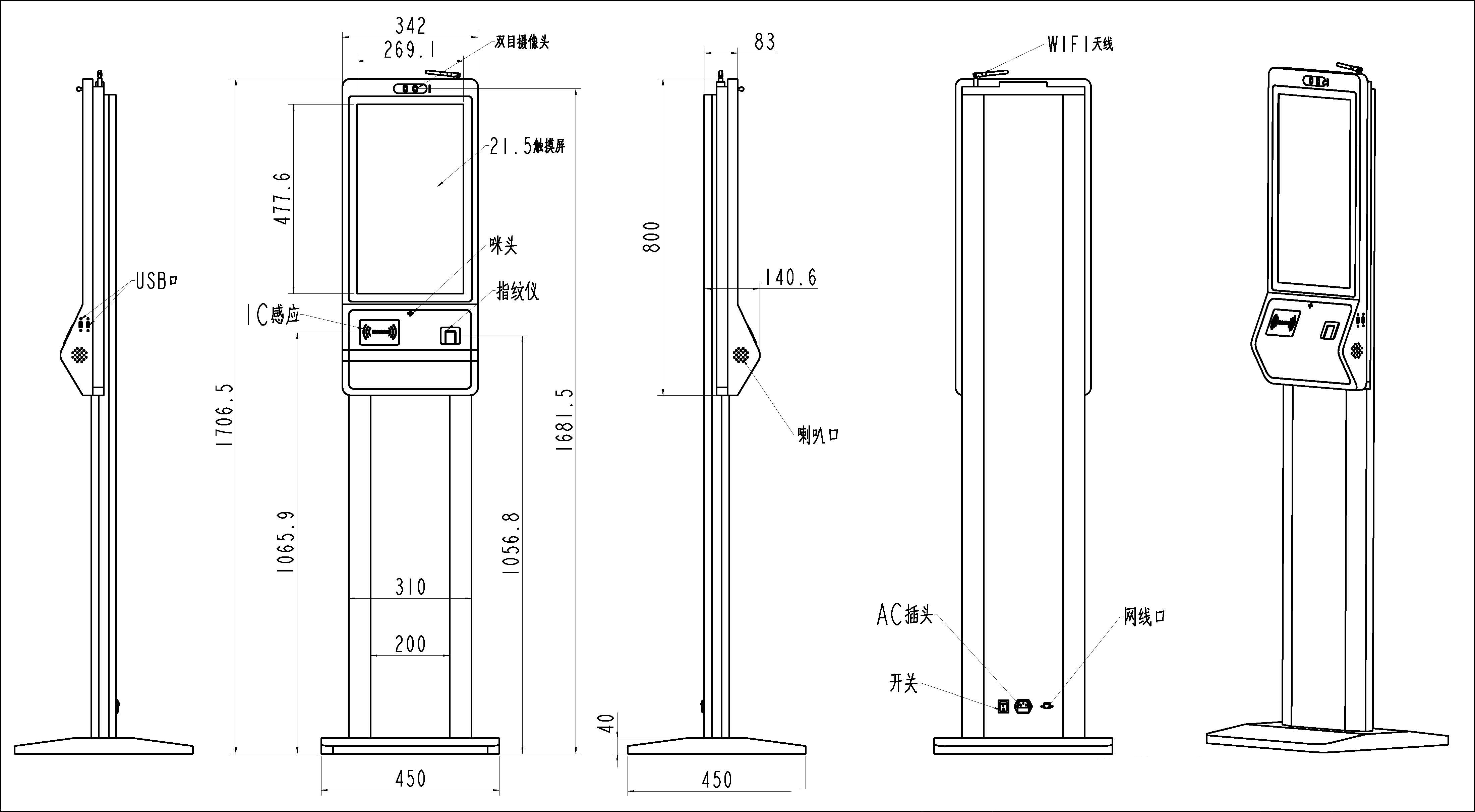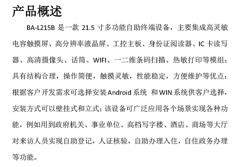 BA-L215B是一款21.5寸多功能自助終端設備,主要集成高靈敏電容觸摸屏、高分辨率液晶屏、工控主板、身份證閱讀器、IC卡讀寫器、高清攝像頭、話筒、WIFI、一二維條碼掃描、熱敏打印等模組;具有結構合理,操作簡便,觸摸靈敏,性能穩定,方便維護等優點;根據客戶開發需求可選擇安裝Android系統 和WIN系統,安裝方式分為壁掛式和立式;該設備可廣泛應用各個場景實現各種功能,例如用到政府機關、事業單位、高檔寫字樓、酒店、商場等大廳對來訪人員實現自助登記,人證核驗,自助辦理入住,自住政務辦理等功能。
