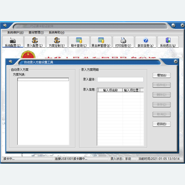 所謂自動錄入就是讀取二代證信息時,在信息顯示的同時,自動把方案所定義的信息錄入到相關應用程序的指定窗體中。