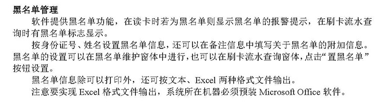 軟件提供黑名單功能,在讀卡時若為黑名單則顯示黑名單的報警提示,在刷卡流水查詢時有黑名單標志顯示。