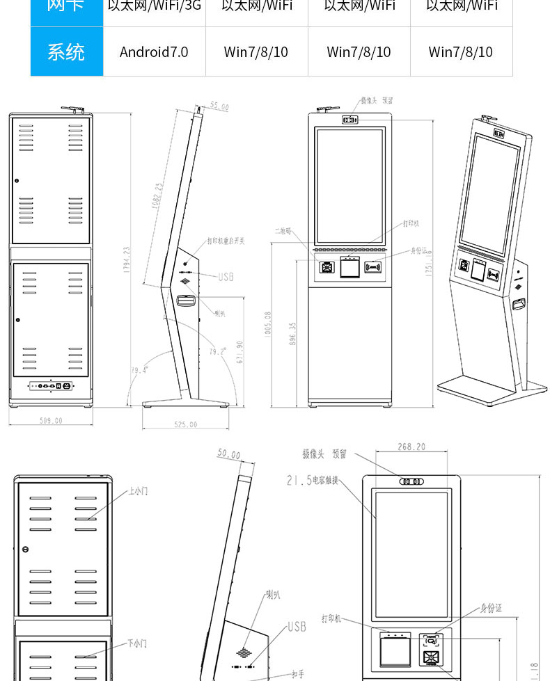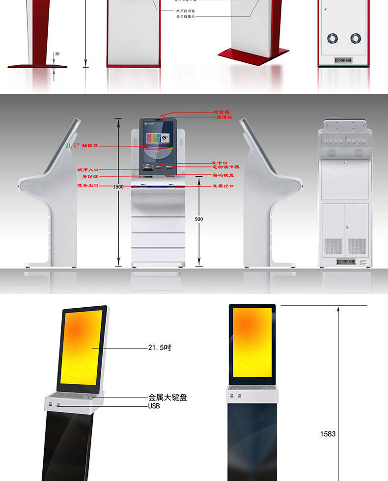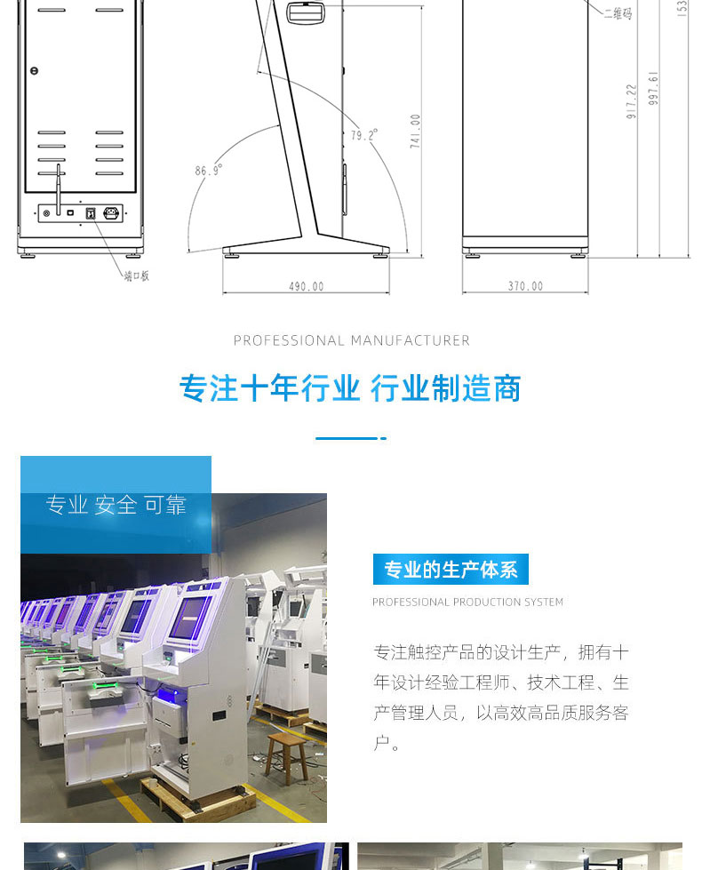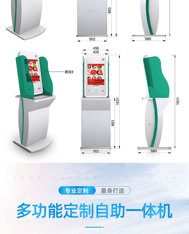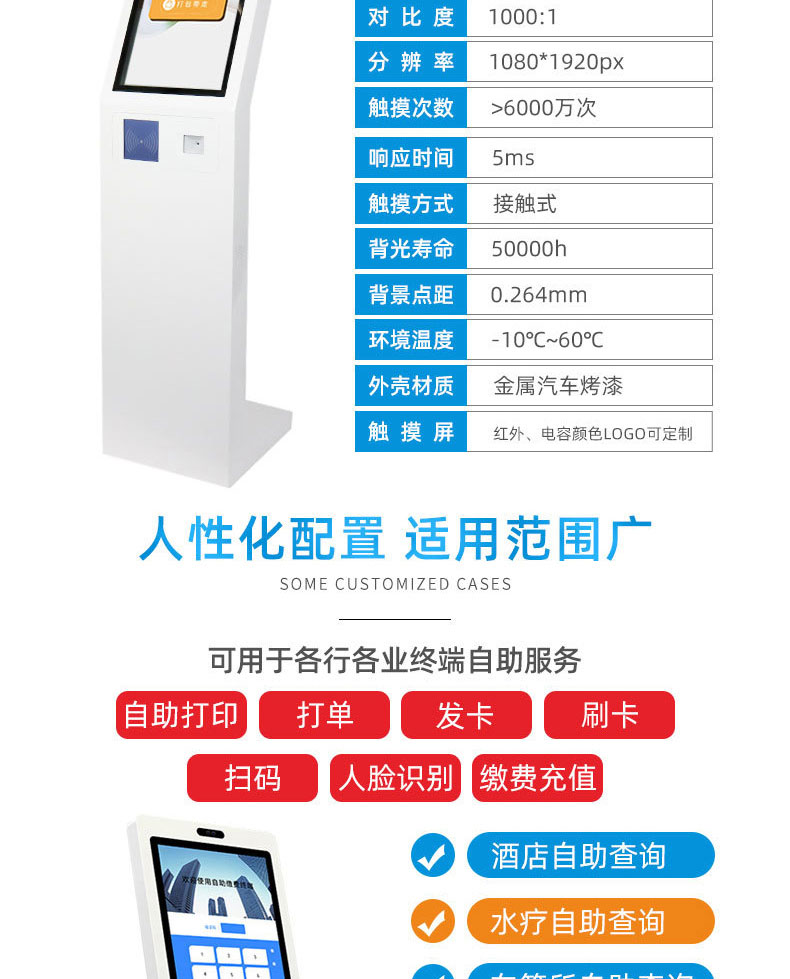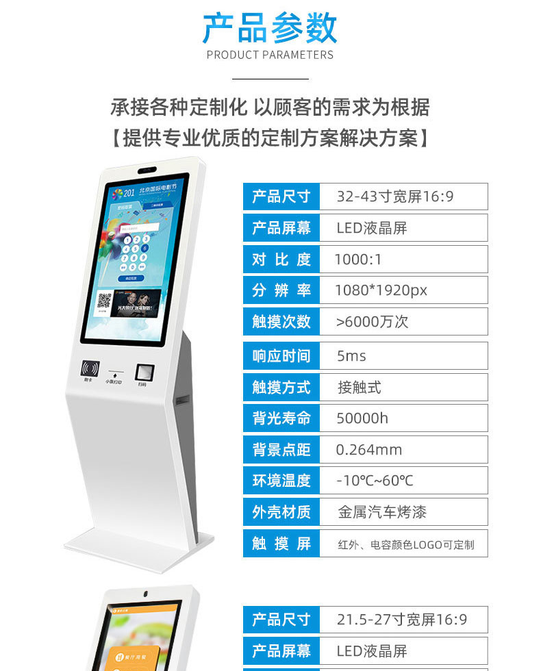 擁有專業的生產線,嚴格的質量把控。耐心的咨詢服務團隊及專業的技術負責團體。 成產以“誠信、團結、務實、創新”的企業精神開拓市場、優化產品細節提供舒適的自助體驗。公司本著“誠信為本,質量至上”的取勝之道不斷開發自助終端在各行業的應用,打造方便快捷的一站式服務。設備圖紙設計-數控沖壓-折彎-焊接-刮灰打磨-磨砂清洗-噴底漆-高溫烤漆-機柜部件拼裝-配件安裝-整機調試老華測試-打包發貨;制實用的自助終端設備,我們是專業。多種定制款式任意選擇,可根據需求定制外觀屏幕尺寸可選,配件數量可選,主機配置可選。