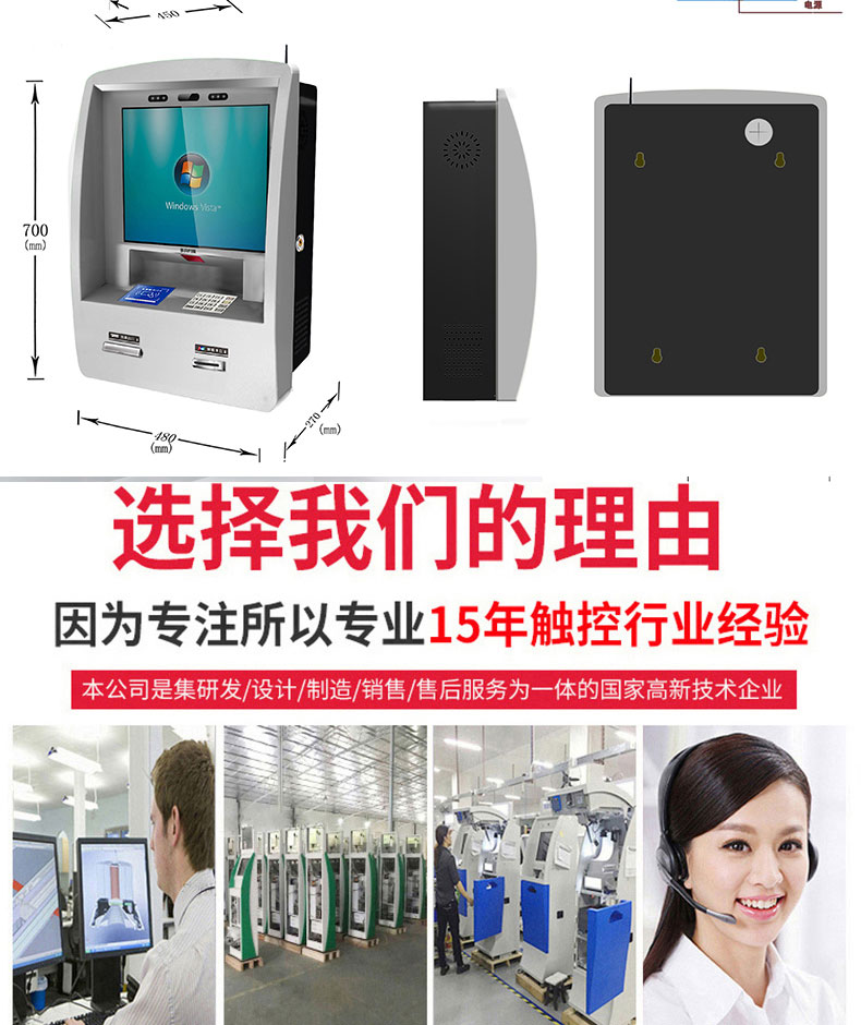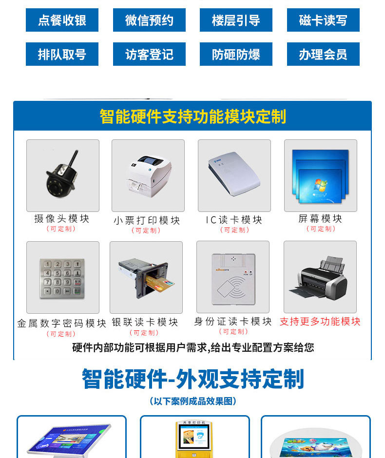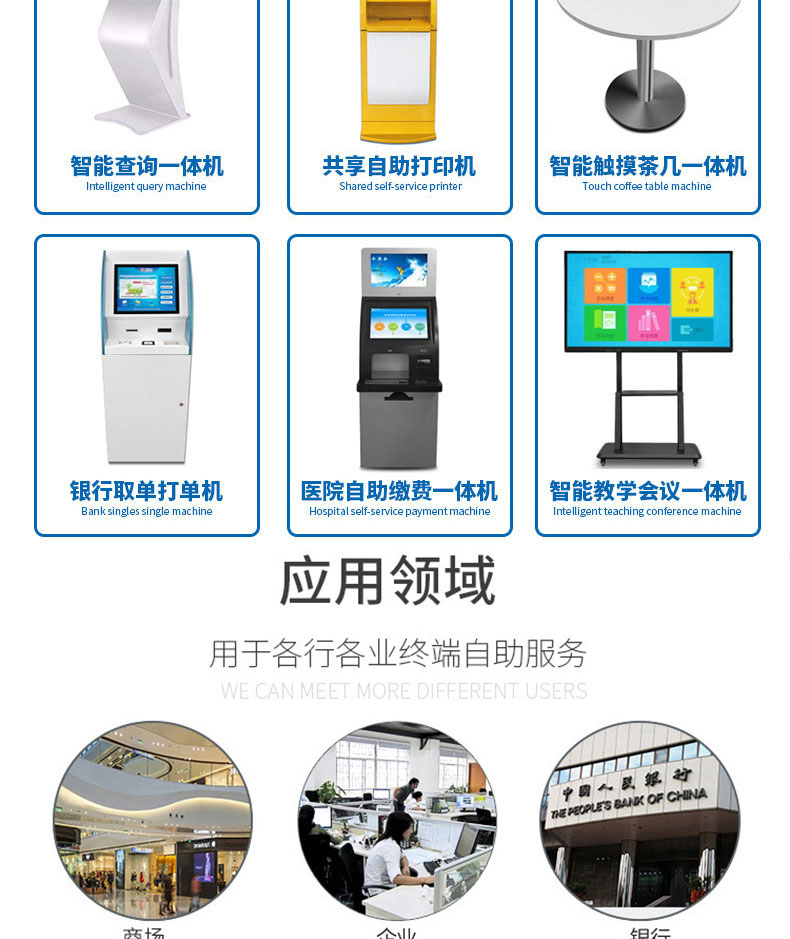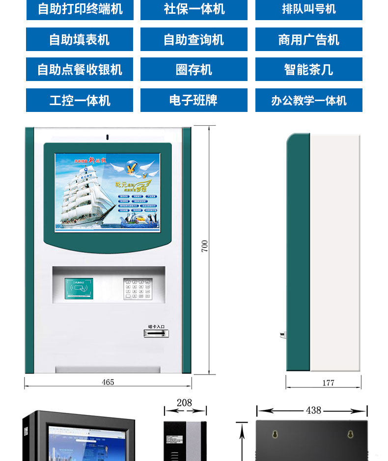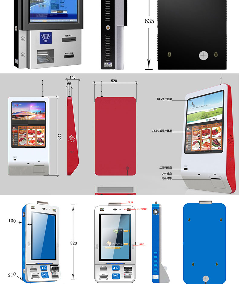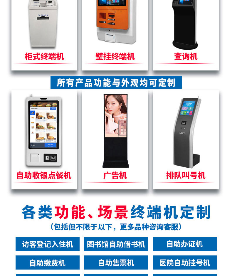 自助終端機定制:定制各種場景各種款式非標終端機;例如訪客機、景區自助取票機、醫院繳費查詢機、醫院自助取單機、社保查詢機、室內外廣告機、排隊叫號機、工控一體機、電力繳費查詢機、圖書自助銷售機、便攜式計算機、酒店自助入住機、自助收銀機等終端。