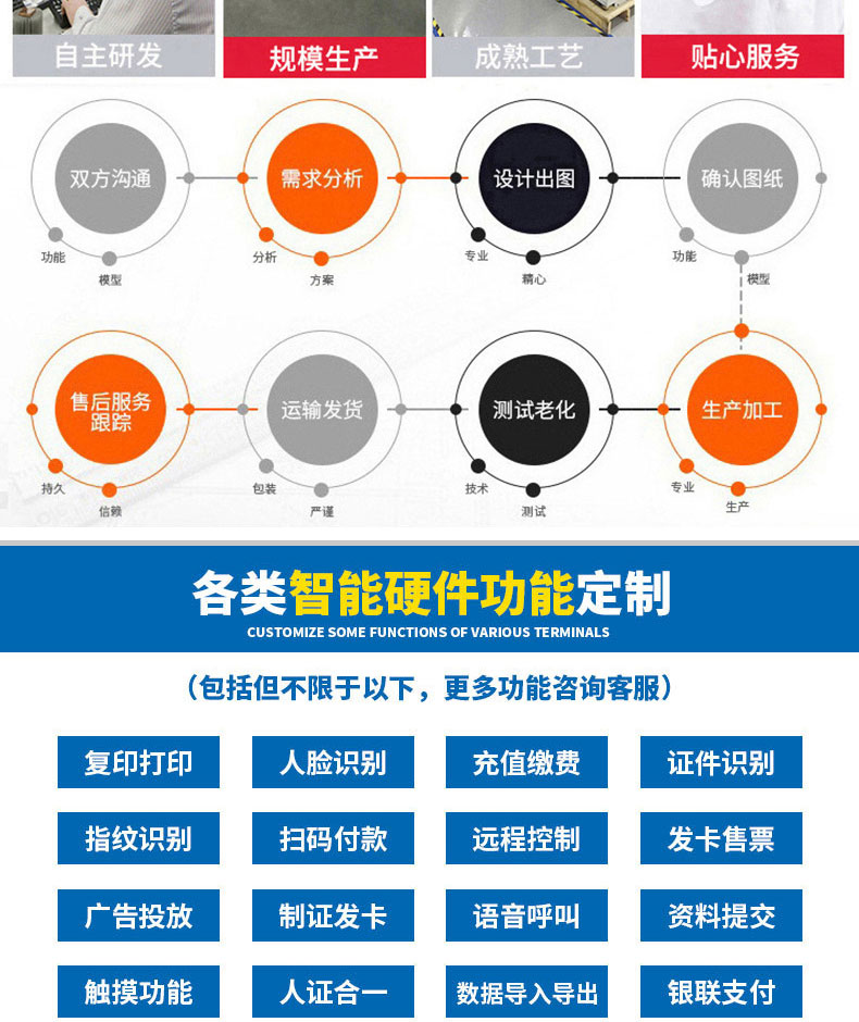 軟件開發定制: 終端機應用系統、酒店自助入住管理系統、訪客登記管理系統、門禁考勤系統、人臉識別系統、快遞柜管理系統、APP、小程序、OCR識別等軟件的開發定制。