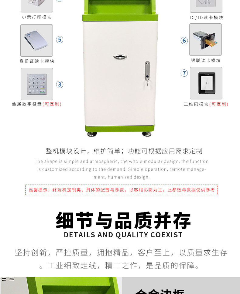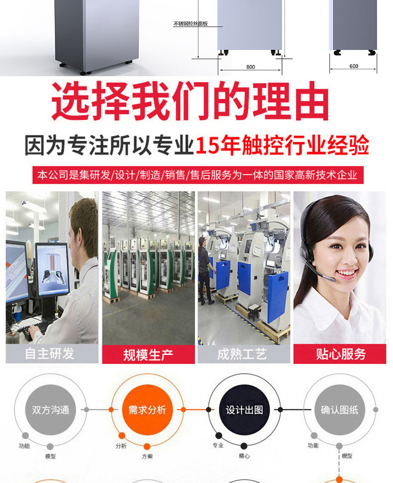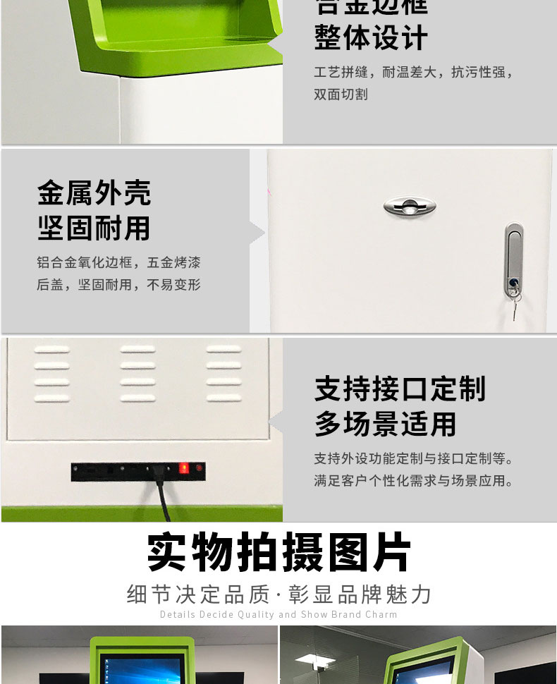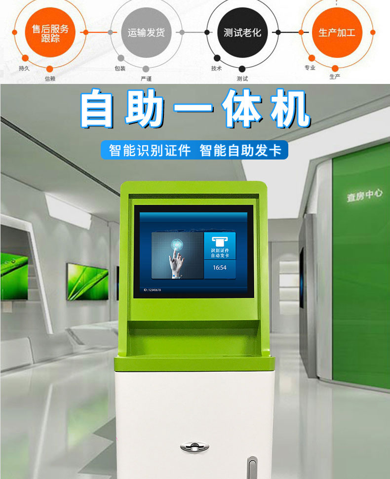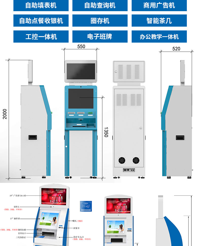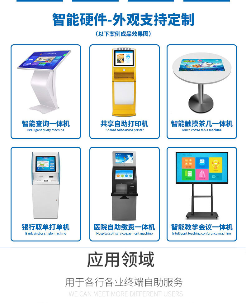自助終端機定制:定制各種場景各種款式非標終端機;例如訪客機、景區自助取票機、醫院繳費查詢機、醫院自助取單機、社保查詢機、室內外廣告機、排隊叫號機、工控一體機、電力繳費查詢機、圖書自助銷售機、便攜式計算機、酒店自助入住機、自助收銀機等終端。