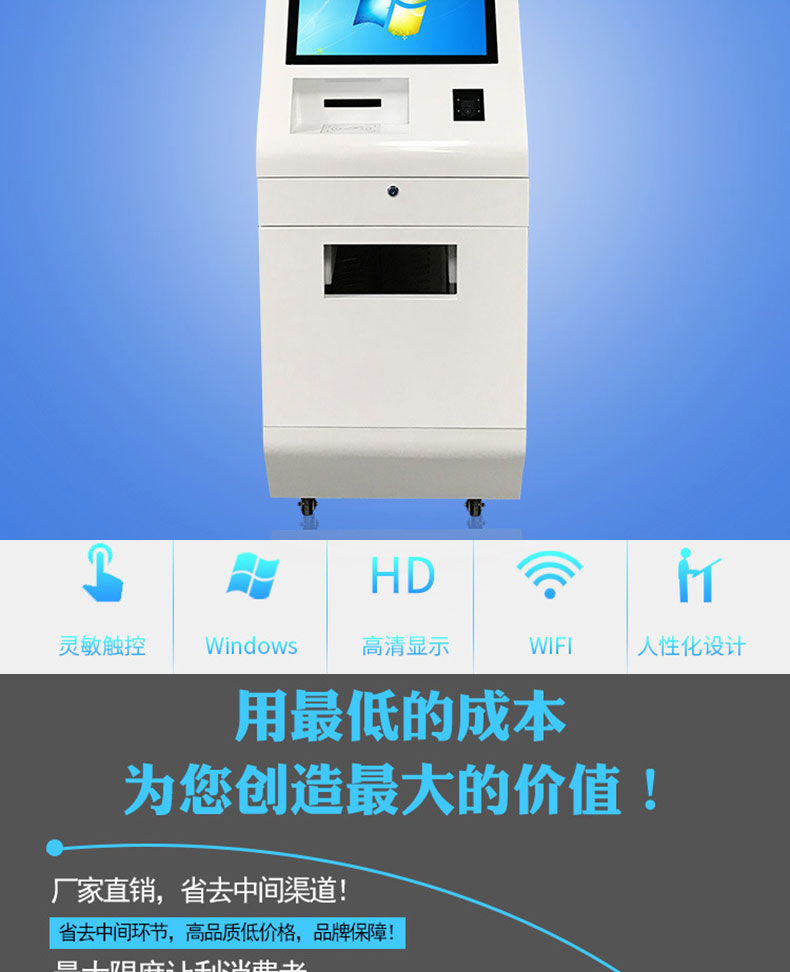 專業(yè)提供電腦觸控產(chǎn)品、自助服務(wù)終端的設(shè)計(jì)及生產(chǎn)服務(wù),主要產(chǎn)品自助終端機(jī)、自助打印機(jī)、自助取票機(jī)、自助查詢機(jī)、自助繳費(fèi)機(jī)、自助發(fā)卡機(jī)、自助政務(wù)一體機(jī),產(chǎn)品使用于各個(gè)行業(yè);醫(yī)院、學(xué)校、銀行、酒店、景區(qū)等。。。。。公司擁有專業(yè)的生產(chǎn)線,嚴(yán)格的質(zhì)量把控。耐心的咨詢服務(wù)團(tuán)隊(duì)及專業(yè)的技術(shù)負(fù)責(zé)團(tuán)體。