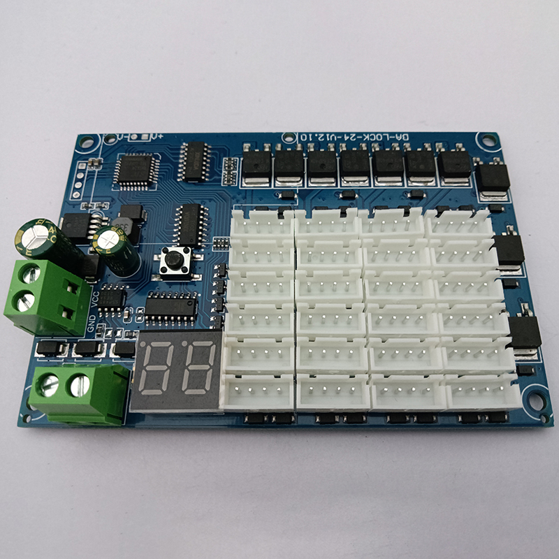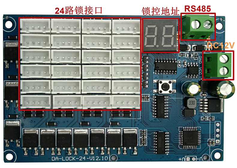 24路鎖控板又名為電子鎖控制模塊,主要用來控制各類格子柜門電子鎖的開與關,板子集成24路鎖控杜邦接口,485通信接口,DC電源接口,鎖控地址顯示模塊,一鍵全開功能!板子通過485通信協議,實現電腦串口助手發送數據開鎖和獲取箱門狀態反饋!