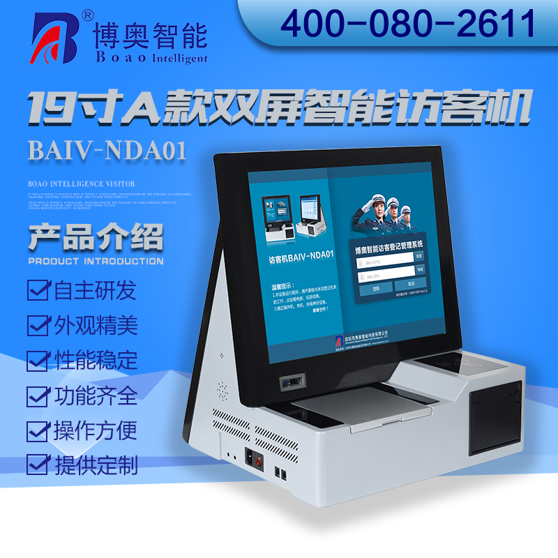 ? ? ? 19寸A款雙屏智能訪客機是博奧智能自主開發,采用人體工程學與模塊化設計相結合,融合計算機、觸摸屏手寫、證件識別(OCR),射頻識別、指紋生物識別、熱敏打印、條碼、數碼攝像、自動制證、硬件加密、網絡等技術;選用鈑金材料、表面噴粉工藝加工出來的一款訪客管理終端,訪客管理終端內部裝有WIN7操作系統 SQL Server數據庫及我公司自主開發的訪客登記管理軟件等主要軟件,從而匯集成了一套完善的智能訪客登記管理系統,它具有外觀精美,功能完善,操作方便等特點。