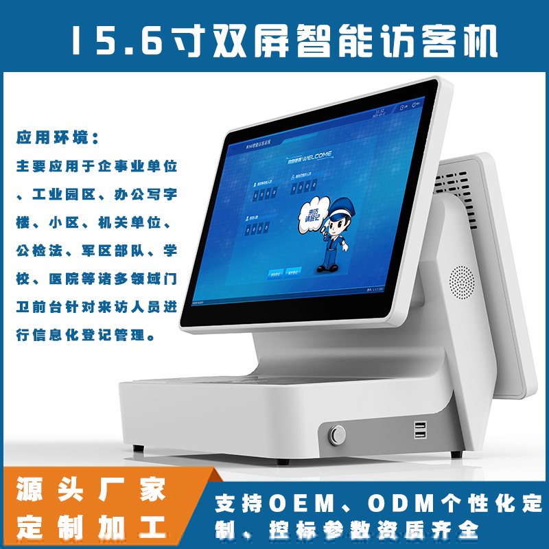 總的來說,15.6寸雙屏智能訪客機是一種高效、安全且用戶友好的訪客管理設備,適用于各種場所和場景的訪客登記和管理需求。